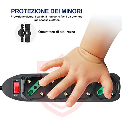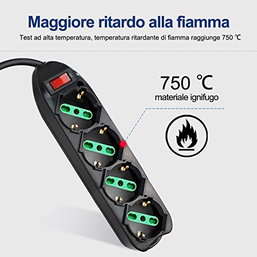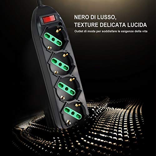 Ciabatta Elettrica Multipresa Protetta,Surge Arrest,Protezione da sovraccarico,Protezione da surriscaldamento,Spina 10A,Prese 4 Italiana/Tedesca, Interruttore di sicurezza,Cavo da 1.5m.
