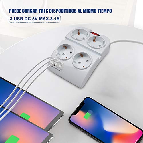 ExtraStar Multipresa con prese e porte USB e interruttore, cavo di alimentazione lungo 1,5 metri, con spina e protezione per bambini Europe 3680 W 230 V 16 A (4 prese e 3 USB)
