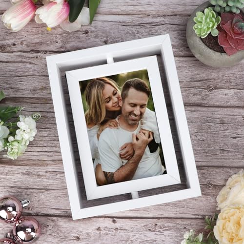 EXYGLO Set di 2 Cornici 10x15 Girevoli a 360 Gradi con Doppio Vetro, Cornice Rotante Bianca in Legno MDF per Visualizzazione Verticale o Orizzontale sul Tavolo