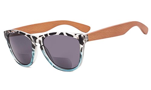 Eyekepper Occhiali da sole bifocali per donne diottrie +1.50 Occhiali da lettura di sole con aste di legno (Montatura Blu-Leoparda)