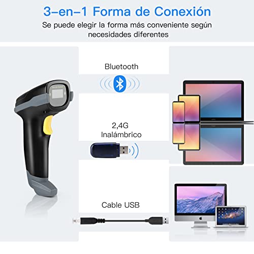 【Bluetooth & 2.4G Wireless & Cavo USB】: lo scanner di codice a barre è dotato di Bluetooth, wireless 2,4 G e cavo USB, che lo rende collegabile con smartphone, tablet e computer. È compatibile con Windows XP / 7 / 8 / 10, Mac OS, Android e iOS, ecc.