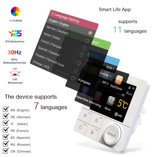 【Multifunzionale e Facile da Utilizzare】 Grazie al suo menu a più livelli, il nostro termostato è estremamente facile e intuitivo da utilizzare. Supporta 7 lingue ( Inglese, Tedesco, Italiano, Francese, Spagnolo, Russo e Cinese), facilitando l'uso per chiunque.