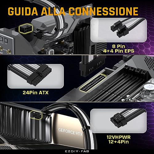 Questo cavo di prolunga con manicotto da 1 a 3x 8 Pin sostituisce la complessa configurazione di connessione del cavo originale da 1 a 4x 8 Pin, che è antiestetica e poco sicura. Utilizzate il cavo di prolunga EZDIY-FAB, la soluzione migliore per la sicurezza e l'estetica.
