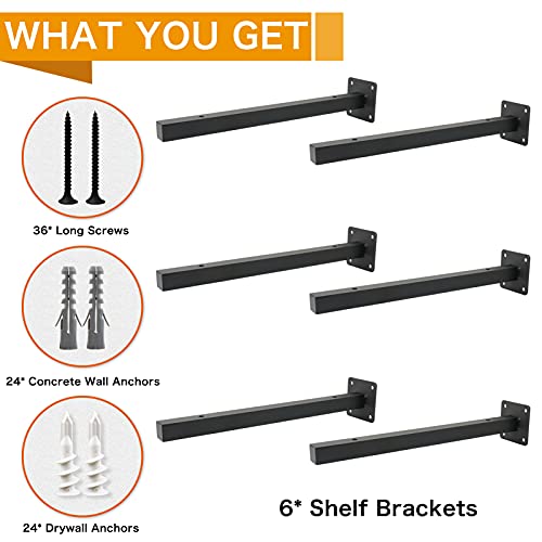 Contenuto della confezione: 6 staffe per mensole, 36 viti lunghe, 24 tasselli da parete contrete, 24 tasselli per cartongesso, ben confezionati e forniti con tutto l'hardware di cui potresti aver bisogno. (La tavola di legno non è inclusa)