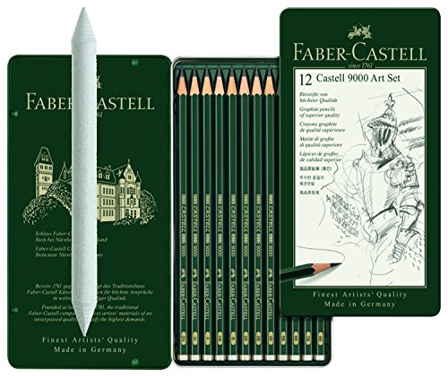 Faber-Castell 119065 - Matite di grafite Castell 9000, set da 12 pezzi, 8B - 2H, con tergicarta per Belle Arti Faber Castell 122780