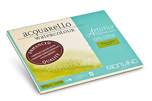 Fabriano Artistico Acquarello Watercolour, colore bianco naturale, grana grossa, 23 x 30,5 cm, 20 fogli da 300 g/m², cartoncino per acquerello di alta qualità, incollato su 4 lati, vegano