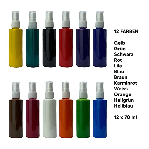 Fabric Paint. Set di colori per tessuti, 12 colori x 70 ml, colori a spruzzo per tessuto, maglietta dipinta, batik, impermeabile, colori altamente pigmentati per tessuti