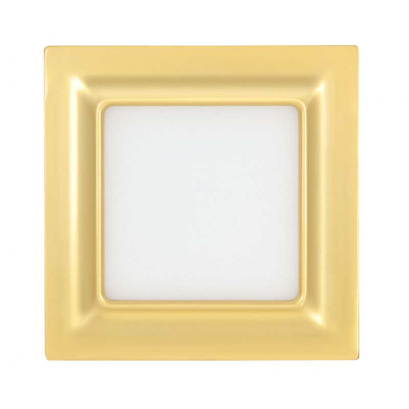 Faretto da incasso quadrato modello VENTURA in colore oro perla. Ha una potenza luminosa di 9 watt, 720 lumen e 3000K. La sua misura è 12X12X1,5 centimetri e il taglio è 10,5x10,5 centimetri. Peso netto, 225 grammi.