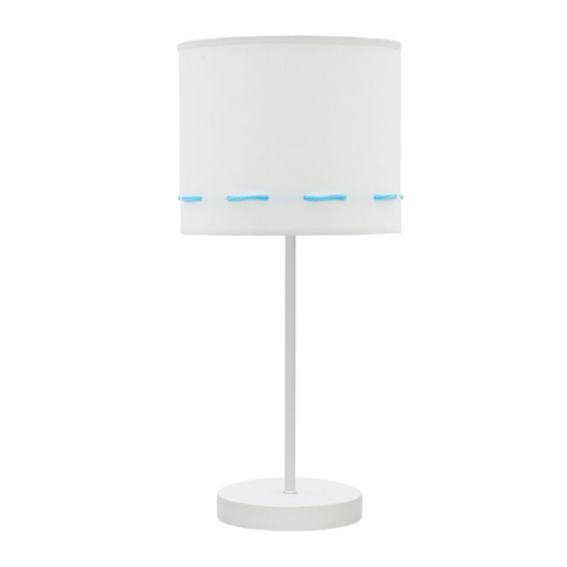 Desktop TRAZOS serie di colore azzurro e cornice bianca. Il suo diametro è di 17 cm e, come il ciondolo, gioca con piccole tracce di filo azzurro intorno al suo perimetro. Ha un portalampada E14.