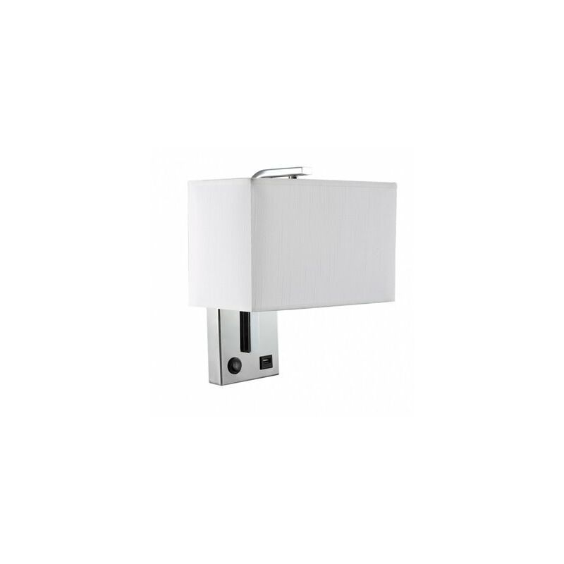 Applique della serie AGATHA in colore CROMO con paralume BIANCO. Realizzato in materiale tessile e metallo. Si caratterizza per avere un portalampada E27, lampadina non inclusa, e una PORTA USB. Dispone inoltre di un interruttore cut-off sul davanti e si distingue per la forma quadrangolare del suo schermo, aggiungendo un tocco di eleganza e raffinatezza alla stanza che illumina. Le sue dimensioni sono 27x25x15 centimetri. È ideale per camere da letto decorate nei toni del bianco, grigio e freddo. Disponibile anche in color cuoio con sfumatura beige.
