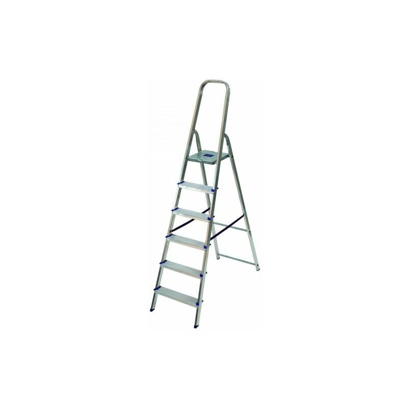 Struttura in alluminio, inclinazioni montanti diverse per ridurre gli ingombri e meglio avvicinare il corpo al punto di lavoro, paracorpo alto ad arco chiuso, gradini antisdrucciolo mm. 82 fissati ai montanti con tecnica autoperforante, piedini antiscivolo in pvc, cinghie in poliestere (a partire da mod. 5 gradini), pedana in acciaio speciale con nervature profonde, particolarmente indicata per aree domestiche. Portata kg. 150, certificata EN131.