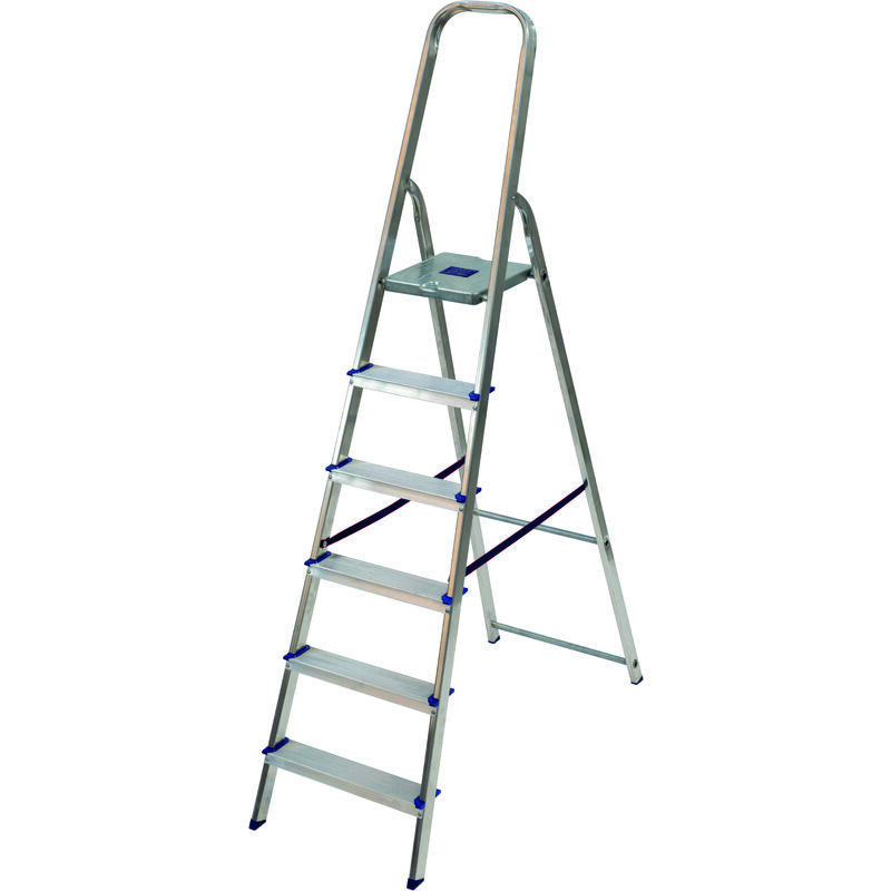 Facal scala in alluminio alfa 8 gradini Struttura in alluminio, inclinazioni montanti diverse per ridurre gli ingombri e meglio avvicinare il corpo al punto di lavoro, paracorpo alto ad arco chiuso, gradini antisdrucciolo mm. 82 fissati ai montanti con tecnica autoperforante, piedini antiscivolo in pvc, cinghie in poliestere (a partire da mod. 5 gradini), pedana in acciaio speciale con nervature profonde, particolarmente indicata per aree domestiche. Portata kg. 150, certificata EN131. Articolo produttore: LF/8