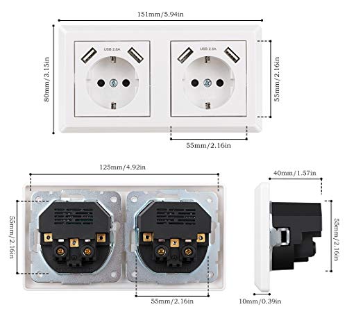 Certificazioni importanti: la doppia presa USB è certificata CE, RoHS e TÜV. Dimensioni del telaio: 151 x 80 mm, senza dimensioni del telaio: 125 x 55 mm (standard 55).