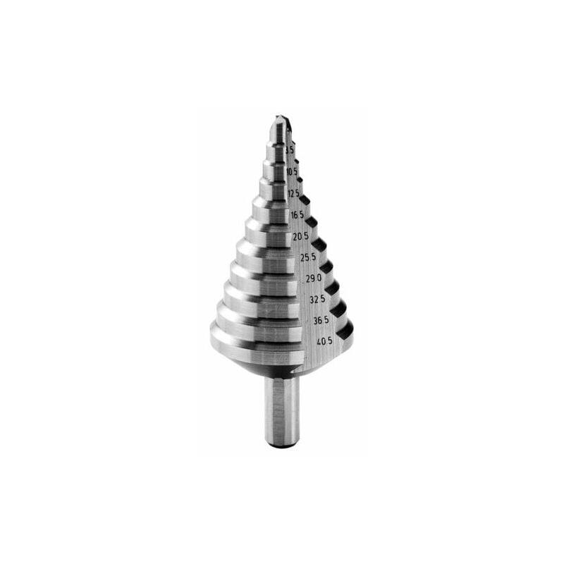 Trapano a gradino ISO - Per la foratura cilindrica e precisa di tutti i materiali. Non necessita di preforatura. Gambo cilindrico con 3 lamelle per un buon azionamento che evita i micro-bloccamenti. Marcatura dei diversi diametri. 678014: Specifica per i box di riempimento PG. Capacità di foratura per lamiere di spessore fino a 4 mm. Diametro del gambo 10 mm.