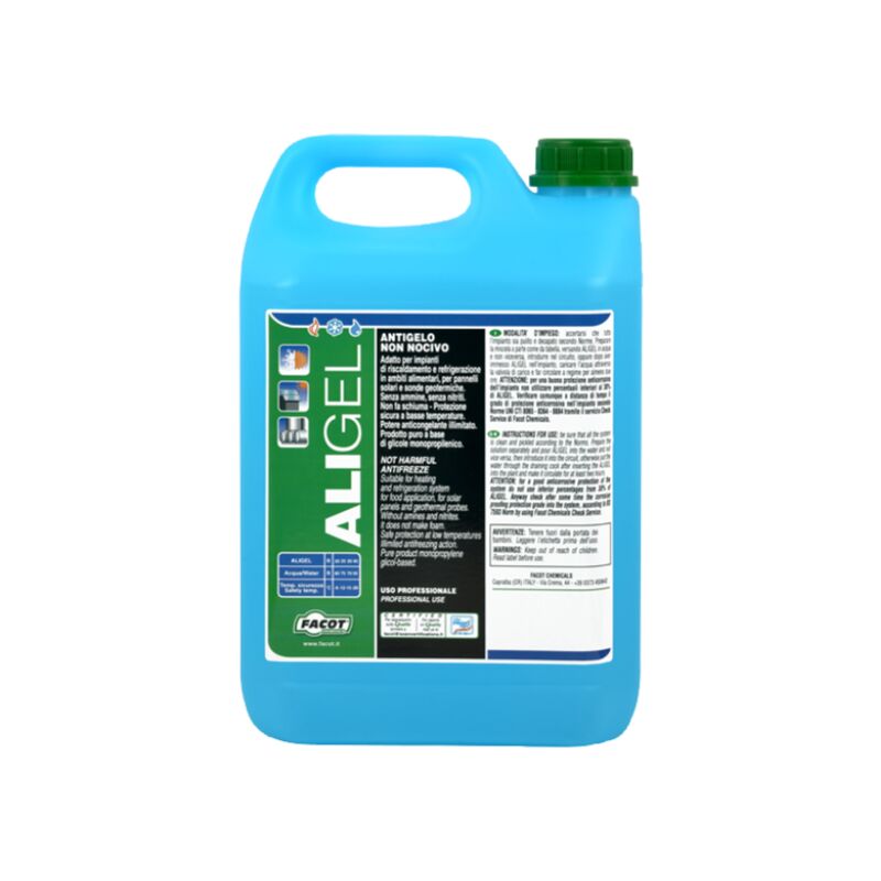 Aligel anticongelante per impianti solari termici 5 kg Facot ALIK005 Anticongelante puro, permanente, a base di GLICOLE MONOPROPILENICO per impieghi nel CAMPO ALIMENTARE, inibito verso la corrosione. Consigliato per impianti solari termici secondo Norma UNI 8065:2019. Modo d'Uso: Diluire secondo il punto di congelamento richiesto seguendo la tabella apposta sulle confezioni e riportata in scheda tecnica.
