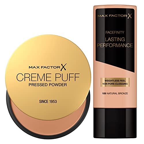 Max Factor Fondotinta Liquido Matte Facefinity Lasting Performance Sebo-Equilibrante Lunga Tenuta 109 Natural Bronze + Crème Puff Pressed Powder Cipria Compatta Opacizzante Lunga Durata 42 Deep Beige