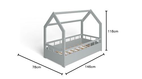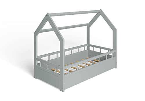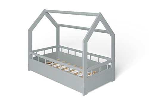 MS FACTORY Letto Casetta in Massello 70x140cm con Telaio a Doghe - Letto per Bambini Singolo con Sponda Anticaduta - Stile Scandinavo Nordico Montessori - Barriere Grigie