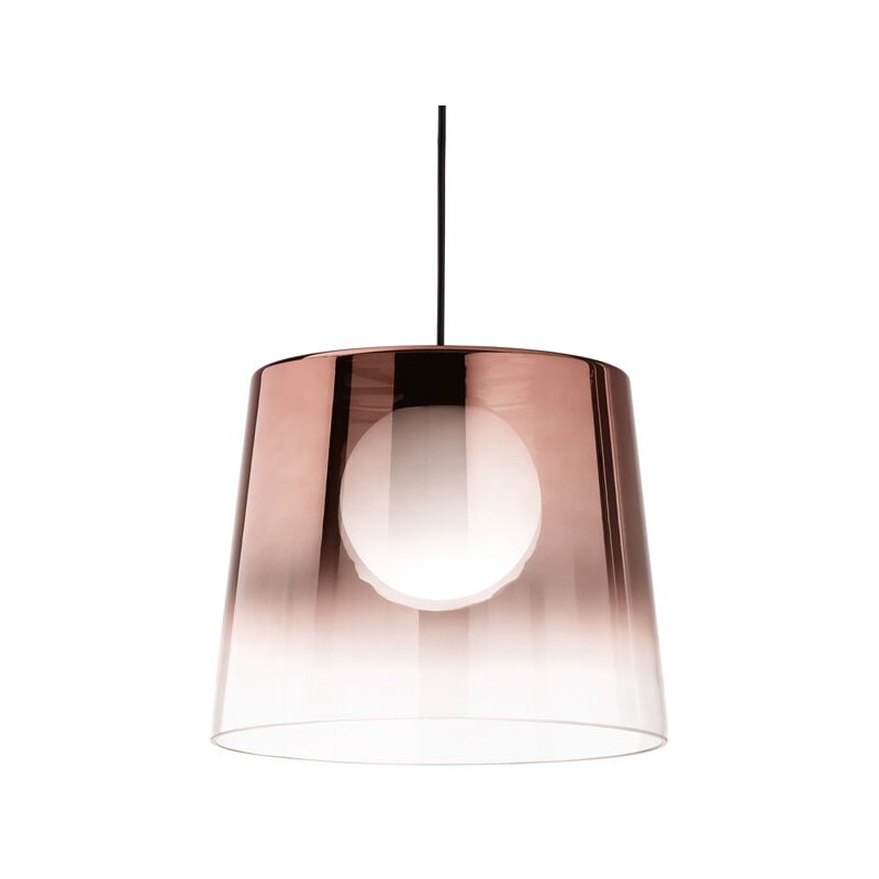Collezione Fade SIA MODERNO SIA VINTAGE Sospensione a 1 luce realizzata con rosone e montatura in metallo. Paralume in vetro soffiato trasparente con sfumatura galvanica rame.. Diffusore interno in vetro soffiato bianco acidato. Cavo in pvc nero regolabile in altezza. Lampadine LED G9 3W 3000 K.