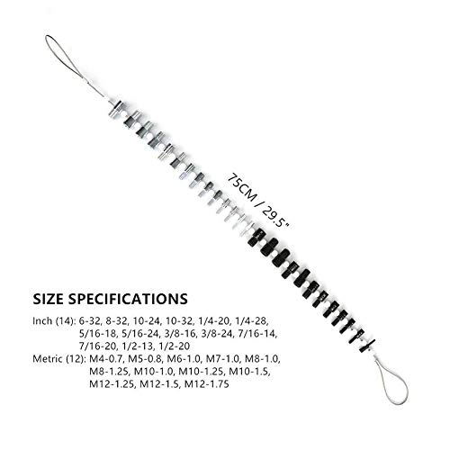 26 specifiche: Ogni dimensione ha un dado e bullone checker sullo stesso calibro. 26 calibri maschio/femmina 14" e 12 metrici. Le dimensioni della filettatura sono stampate in modo permanente su ogni calibro (pollici in rosso, metrico in bianco).