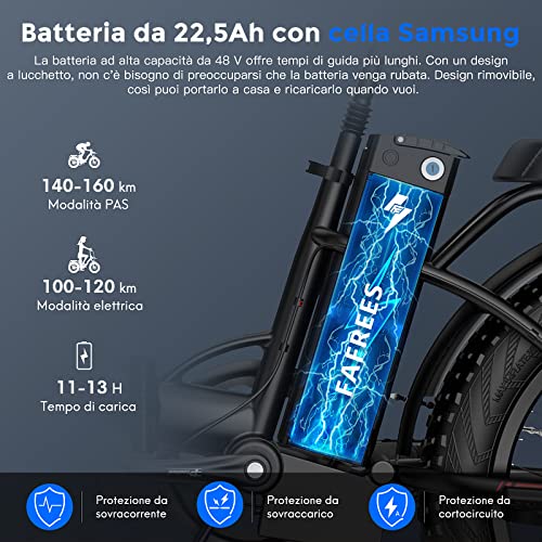 [BATTERIA RIMOVIBILE 48V 22.5AH ULTRA-LARGE] Questa ebike è dotata di una batteria ad alta capacità da 48V 22.5Ah, che offre un'autonomia di guida più lunga, fino a 85 km con la modalità Pure Power con una sola carica. È facilmente sufficiente per gli spostamenti quotidiani e per le corse avventurose. Grazie al design con serratura, non c'è bisogno di preoccuparsi che la batteria venga rubata. Design rimovibile, per poterla portare a casa e ricaricarla quando si vuole.