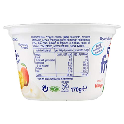 Yogurt colato magro (latte vaccino scremato, fermenti lattici vivi), (mango e purea di mango concentrato) 8%, zucchero, amido di mais, succo concentrato di limone, aroma naturale