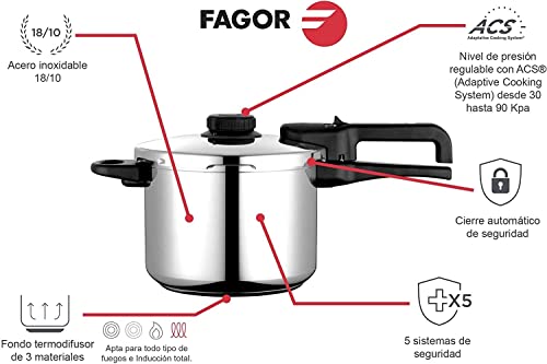 Fagor Dual Xpress Pentola a pressione 8 litri, Induzione, Express Super rapida, acciaio inox. 18/10, Tipo Cucina, Fondo Termodiffusore, Regolatore di Pressione, 5 Sistemi Sicurezza, Include Chiusura