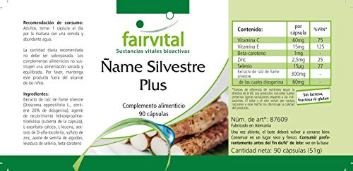 ✔ QUALITÀ TEDESCA Fairvital: Dose giornaliera: 1 capsula al giorno contiene 60 mg di vitamina C, 15 mg di vitamina E, 1 mg di betacarotene, 2,5 mg di zinco, 15 µg di selenio, 300 mg di estratto di igname selvatico, di cui 60 mg di diosgenina. Altamente dosato! Ottimo rapporto qualità-prezzo!