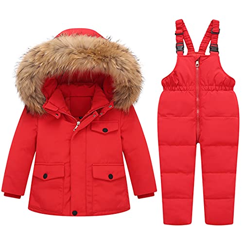 FAIRYRAIN - Piumino da neve per bambini e bambine, con cappuccio e pelliccia artificiale, set di abbigliamento da neve comprendente giacca invernale e pantaloni in piumino