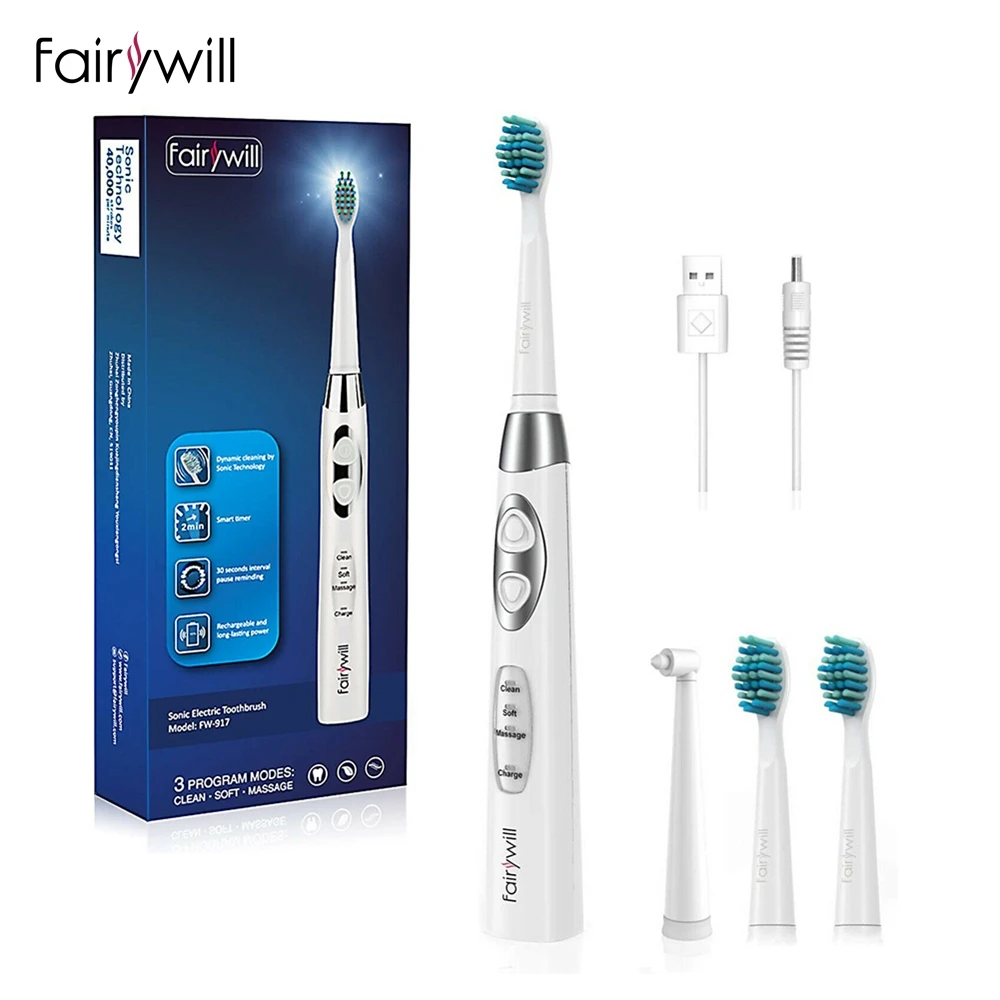 Fairywill Electric Sonic Rechargeable FW-917 Toothbrush USB Fast Charge Waterproof Electronic Tooth Replacement 3 Heads For Adu