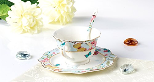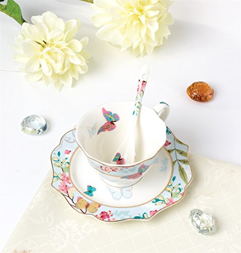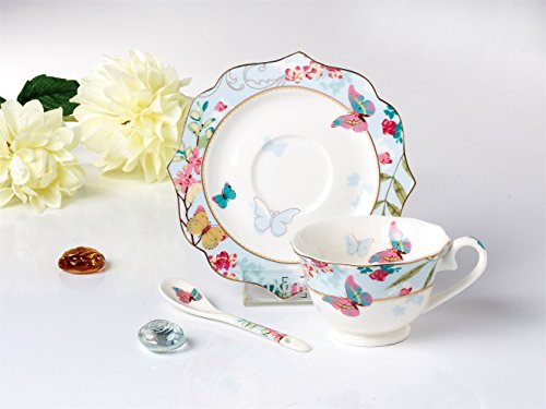FAMIWORKS Fine Bone China Teacup Cucchiaio e Piattino Set, Grande Design Con Farfalla e Fiore Di Ciliegio, 170 Millilitri (Colore Blu)