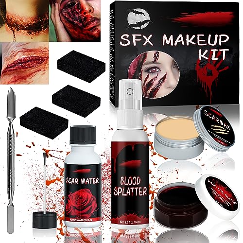 FAMKEEP Kit per Trucchi Halloween Make Up, Kit di Cera per Cicatrici, con Spray di Sangue Finto, Gel di Sangue Finto, Spugna, Raschietto, Adatto per Giochi di Ruolo e Feste di Halloween