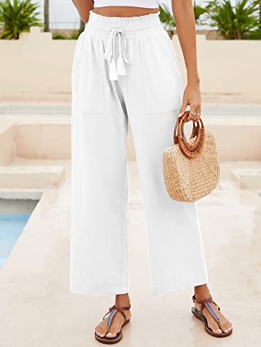 Famulily Pantaloni casual da donna in cotone e lino, pantaloni da salotto a gamba larga con tasche, elastico a vita alta con pantaloni con coulisse, bianco, S