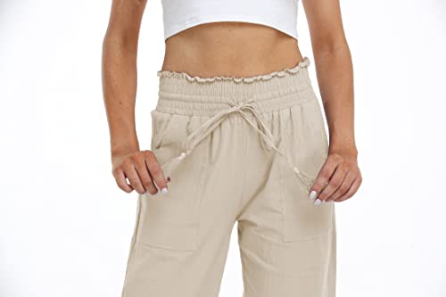 Famulily Pantaloni in lino, da donna, estivi, a gamba larga, a vita alta, per il tempo libero, con tasche, #1: beige, L