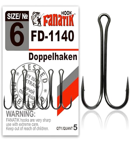 FANATIK Doppio ami da Pesca Double FD-1140 Misure 8, 7, 6, 4, 2, 1, 1/0, 2/0, 3/0 Ganci per Gomma Esche Offset Jig Hook for Soft Baits Lures Fanatic Amo Gancio (Nero, 30mm - #6-5pcs)