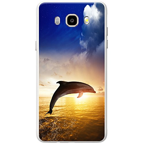 Fancy A Snuggle - Cover rigida per cellulari Samsung, motivo: delfini, PLASTICA, Delfino che salta al tramonto, Samsung Galaxy J5 (2016) (J510FN)