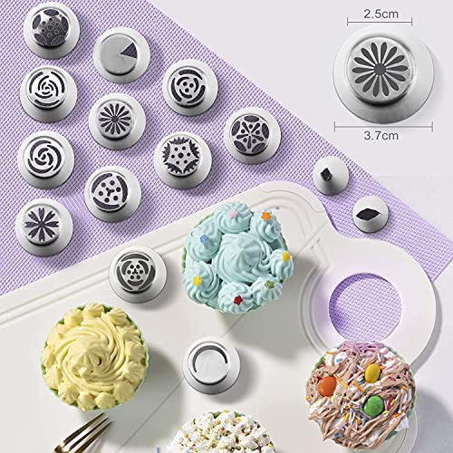 Different Piping Tips: Ci sono 12 diverse punte per piping russe e 2 piccoli ugelli a fiori in una confezione che si possono utilizzare per creare bellissimi motivi come i fiori e le rose, tulipani, foglie e stelle