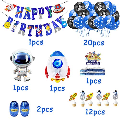 【Set per feste a tema spaziale】 1x banner, 20x 12 pollici palloncini in lattice, 2x nastro, 1x palloncino foil a razzo (61 cm * 75,5 cm), 1x palloncino astronauta in foil ( 65 cm * 86 cm), 1x Topper per torta grande, 12x Cupcake Toppers.