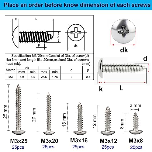 FandWay Viti autofilettanti, viti autofilettanti a testa tonda M3 x 8/10/12/16/20 mm, in acciaio inox A2-70, viti autofilettanti (25 per dimensione)