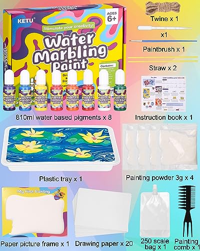 Set di pittura per bambini: 8 colori, 20 fogli di carta, 4 bustine di polvere per dipingere, 2 contagocce, 2 aghi per dipingere, 1 pennello, 1 vassoio per la pittura, 1 pettine, misurino da 250 ml, 1 spago, 1 cornice di carta, 1 libretto di istruzioni. Imparate le tecniche tradizionali di marmorizzazione con queste istruzioni artigianali. Lasciate che la vostra creatività si scateni e create bellissimi disegni che sono unici come voi.