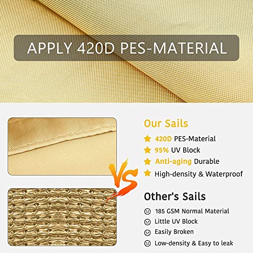 【Materiale di alta qualità】: Realizzato in tessuto di poliestere con rivestimento in PU (160 g/m²), ecologico e leggero, impermeabile e con protezione UV. Rilascio di 3 corde di installazione (2,5 m ciascuna), robusta lavorazione di cucitura su ogni lato, anello a D in acciaio inox su ogni bordo del tetto triangolare impermeabile da giardino, garantisce l'installazione fissa.