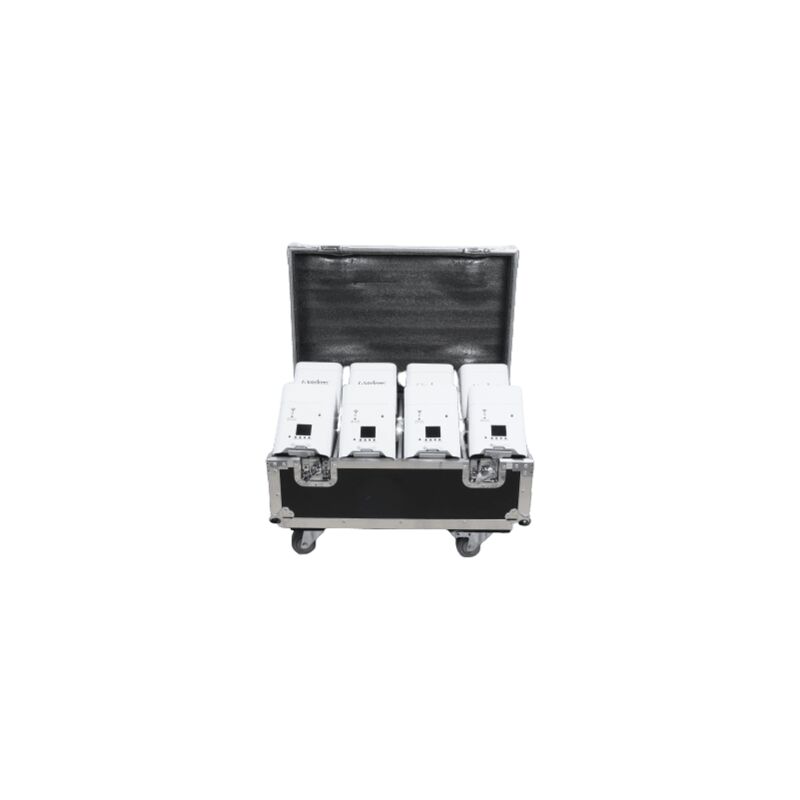 Baule di 8 Faretti PAR LED a batteria ricaricabili con controllo wireless a distanza, composti da 6 led RGBWA 6 in 1 da 18W ciascuno. Solida struttura in alluminio e design moderno e compatto. Grazie alla sua scocca e alla pratica maniglia, nonché alle ridotte dimensioni, risulta molto robusto e semplice da trasportare. Nella parte inferiore si trova una staffa inclinabile per poter orientare il faretto una volta posizionato a pavimento. Controllo tramite Wi-Fi (smartphone e tablet), DMX (wireless e cablato), oppure funzionamento in automatico o musicale. Tramite il DMX e direttamente dal display a led da è possibile controllare: luminosità complessiva, luminosità singoli colori, strobo, macro. SPECIFICHE TECNICHE Potenza: 108W (18Wx6) Tipologia luce: RGBWAUV Tipologia fascio: Largo Canali DMX: 6-10 DMX: In e Out XLR 3 Poli Alimentazione: Powercon IN e OUT Batteria: 9600 mAh Tempo di ricarica: circa 3 ore Impermeabilità: IP20 Dimensioni: 65 x 46 x 36 cm Peso: 30,00 kg