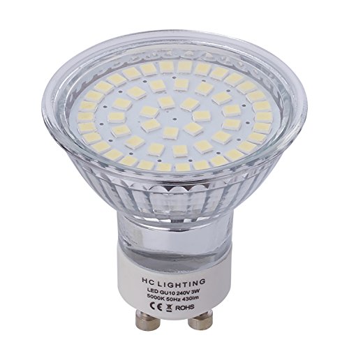 10 faretti LED GU10, luce bianca fredda, 5000 K, 3 W, 430 lm, Ra>80, AC 100-240 V, faretto LED SMD, angolo di illuminazione di 120°, non a intensità regolabile, con vetro di protezione