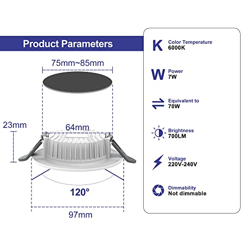 Faretti LED da Incasso per Cartongesso, 7W 700LM Luci da Soffitto Interno, Ultrasottili 23mm, Diametro Foro Ø75 - Ø85mm, Luce Fredda 6000K, 230V, IP44, Set di 3