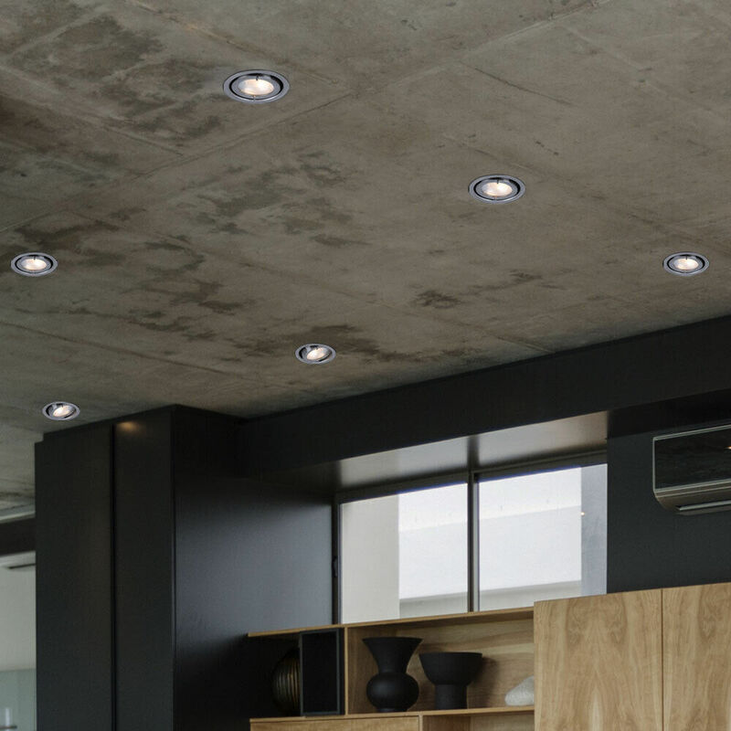 Descrizione Faretti da incasso a LED di alta qualità per il soggiorno. Questo faretto da incasso dalla forma perfetta convince in molti modi. Grazie al design ben ponderato, questo faretto può essere integrato universalmente in qualsiasi spazio abitativo immaginabile con piena soddisfazione. In soggiorno, in ufficio, in sala da pranzo, in cucina o in camera da letto, questo faretto da incasso crea splendidi accenti di luce. Una lampadina a LED è inclusa nella fornitura. La fornitura comprende sei faretti da incasso! Particolare lampada • Tipo di apparecchio: Set di 3 faretti da incasso • Materiale: metallo • Colore: ferro spazzolato • Semplice sostituzione della lampada grazie all'intelligente sistema Easy-Click • Grado di protezione: IP23 • Campo di rotazione: 30° • Dimensioni diametro in cm: 8,3 • Apertura di installazione in cm: 6,8 • Profondità di installazione in cm: 9 • Presa: 1x GU10 • Lampadina inclusa: sì • Potenza della lampada: 1x 8 watt • Flusso luminoso: 1x 430 lumen