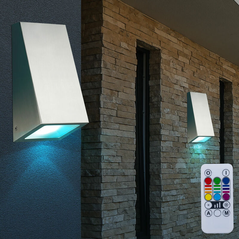 Descrizione Lampada da parete moderna in acciaio inossidabile con un design eccezionale. Questa lampada da parete dal design discreto è realizzata in solido acciaio inossidabile di alta qualità dona ad ogni parete un tocco di esclusività. La superficie è uniformemente rivestita con vernice trasparente resistente agli acidi, agli alcali e agli agenti atmosferici Utilizzando il telecomando in dotazione, la sorgente luminosa RGB può essere impostata in diversi colori e fornisce così un'illuminazione d'atmosfera. I faretti a LED consumano solo una minima quantità di elettricità e sono ancora più bassi nei consumi Luci a risparmio energetico. Questo protegge l'ambiente e il tuo portafoglio. Una lampada LED RGB di alta qualità a risparmio energetico con telecomando per luce bianca e controllo RGB è inclusa nella fornitura. Ci sono due luci esterne nella fornitura! Dettagli • Tipo di lampada: lampada da esterno • Materiale: acciaio inossidabile • Paralume: vetro satinato • Paralume