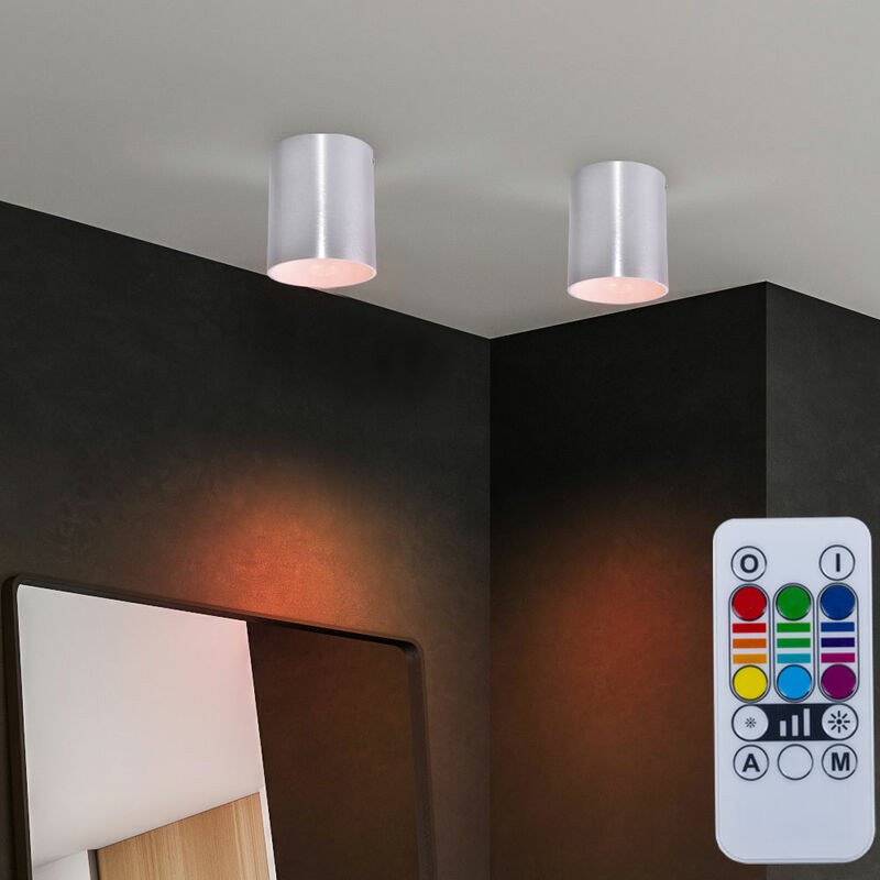 DescrizioneFaretto da superficie di alta qualità per il soggiorno.Non importa in qualunque soggiorno installi questo faretto, crea un meraviglioso accento di luce. Anche la forma e il colore di questo faretto non sono da disprezzare, perché l'alluminio bianco lucido mette un altro accento nelle vostre quattro pareti.Utilizzando il telecomando in dotazione, la sorgente luminosa RGB può essere impostata in diversi colori e fornisce così un'illuminazione d'atmosfera. 2 luci sono incluse nella fornitura!Dettagli luce• Tipo di apparecchio: faretto a plafone • Materiale: alluminio • Colore: alluminio spazzolato, bianco lucido • Grado di protezione: IP20 • Dimensioni diametro x altezza in cm: 10x12• attacco: 1x GU10 • lampadine incluse: si• potenza Sorgente luminosa LED RGB: 3 watt• flusso luminoso LED RGB: 200 lumen • uscita sorgente luminosa alogena: 35 watt • flusso luminoso alogeno: 180 lumen • colore luce: bianco caldo• telecomando: solo per la lampada • alimentazione: 220-240V, 50-60Hz