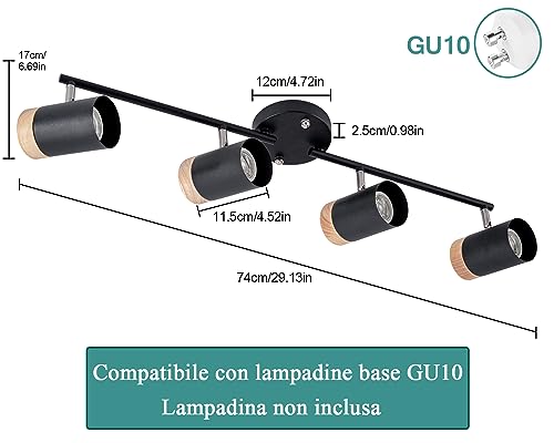 Faretti da Soffitto Orientabili, 4 teste di binario regolabili, Girevole Metallo Legno Lampadario Faretti per Soggiorno, Lampadina non Inclusa [Classe di efficienza energetica A++], Nero, Base GU10