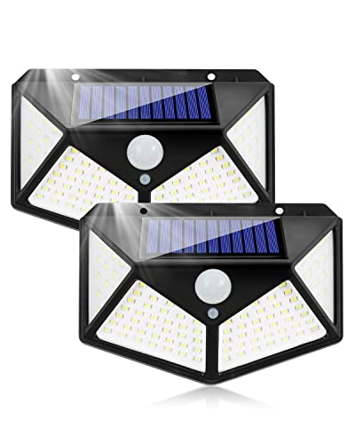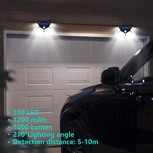 [100 LED e angolo di illuminazione di 270°]: la luci solari esterno con sensore di movimento adotta 100 perline di lampada a LED di alta qualità, che forniscono una maggiore densità di lumen per il tuo giardino, rendendo la luminosità della luce più uniforme e le finestre della lampada sono progettate in quattro direzioni, in modo che la luce della lampada solare possa raggiungere una gamma di 270 gradi.
