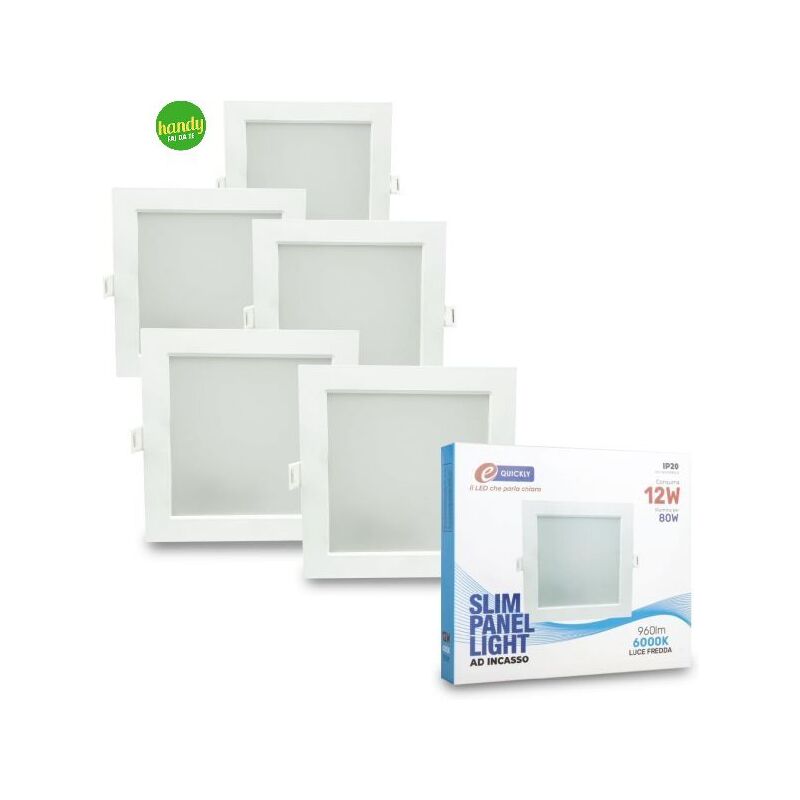 Faretto Led prodotto dal brand E-Quickly. Faretto da incasso quadro con potenza di 12W può generare 960 lumen, luce bianca fredda perfetta 6000K, l'efficienza della luce è uniforme e omogenea. Angolo di fascio luminoso di 120°. Il faretto corrisponde ad una lampadina a incandescenza convenzionale da 80 W. Grado di protezione IP20, ciò significa che è protetto contro l'ingresso di oggetti solidi più grandi di 12 mm Ø ma non è protetto dall'acqua. La confezione contiene un faretto.