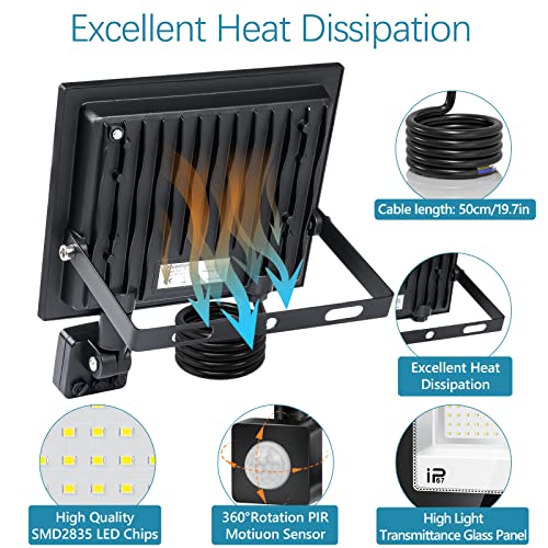 Faretto LED da Esterno con Sensore di Movimento 50W 2 Pezzi, 5000LM 7000K Faro LED Esterno, IP67 Impermeabile Super Luminoso Bianco Freddo Luce di Sicurezza per Garage, Cortile, Patio,Ingresso